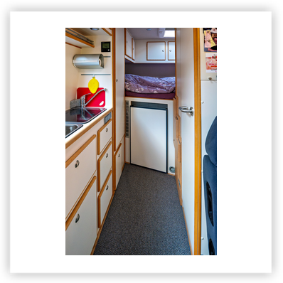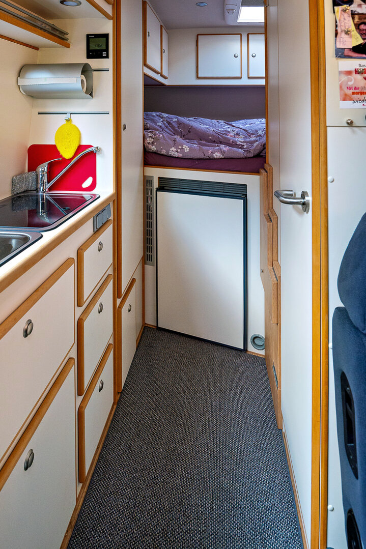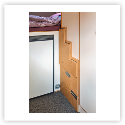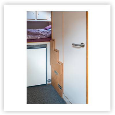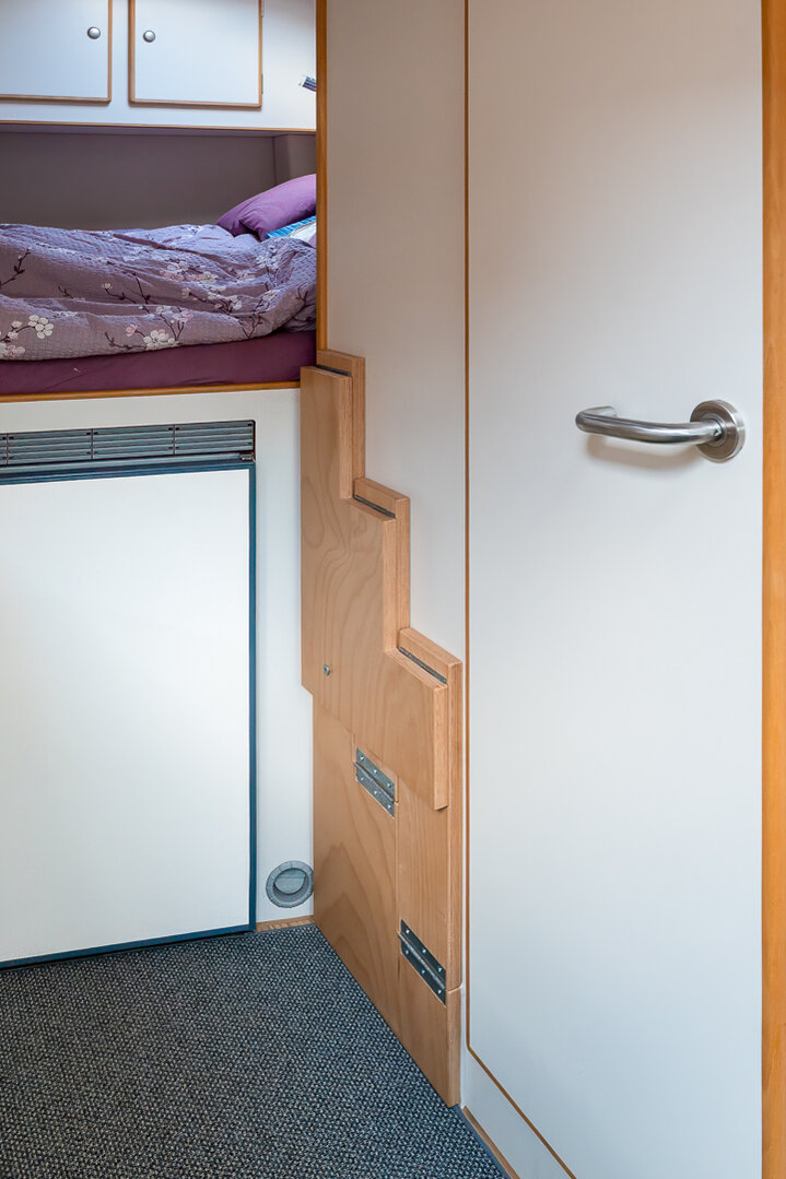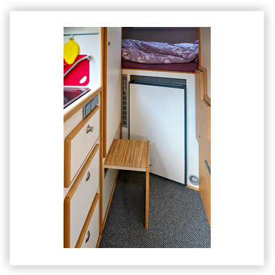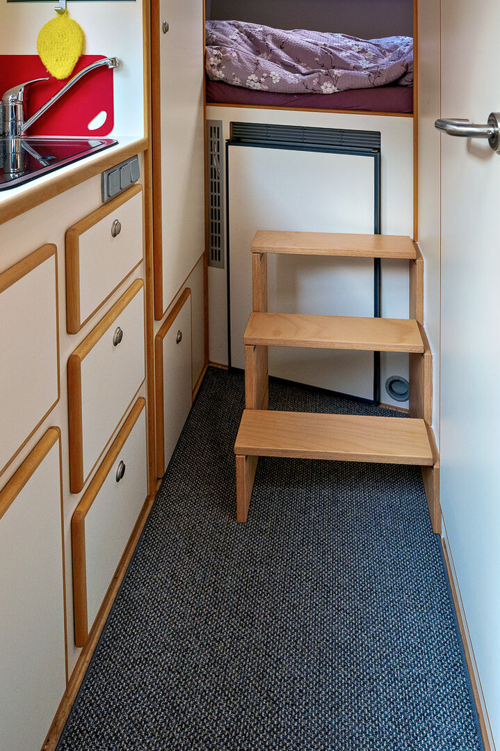 Sicherlich kennt das so mancher Camper nur zu gut, es muss immer möglichst alles auf engsten Raum perfekt passen. Dennoch bleibt einiges nur umständlich oder gar schwer erreichbar und es muss folglich ein individuelle Lösung her. Hier kommt als Beispiel die individuelle gefertigte "Klappbare Einstiegshilfe" aus dem Hause Schepers zum Einsatz. In unserem Musterbeispiel -siehe Bilder-, lässt sich sehr gut der Vergleich zu einer Standardversion erkennen. Um hier das hochlegende Bett zu erreichen ist in der Standardversion gerade mal eine ausziehbare jedoch viel zu niedrige Fußbank vorhanden, die somit einfach nur unpraktisch ist. Es erfordert zumindest eine gewisse sportlich Fitness, um hier das Bett bequem erreichen zu können. Anders dagegen ist unsere speziell gefertigte Schepers "Klappbare Einstieghilfe" mit 3 Stufen, die nahezu unsichtbar sprich sehr flach an der Wand montiert wurde und bei Bedarf einfach nur ausgeklappt werden muss.
