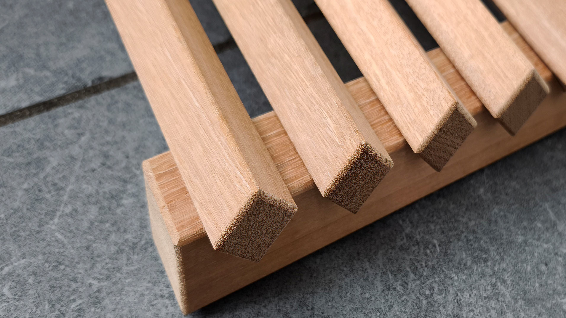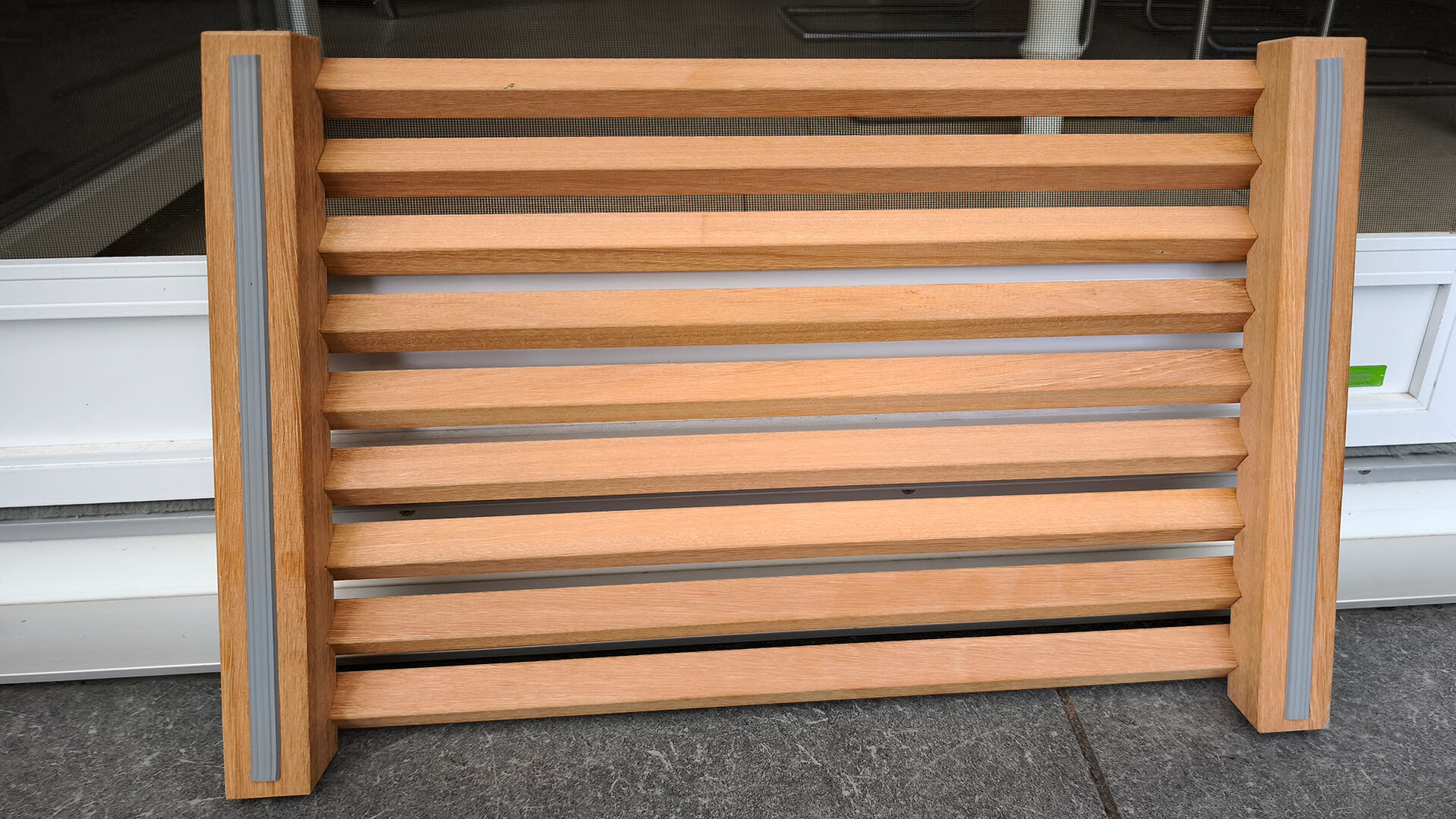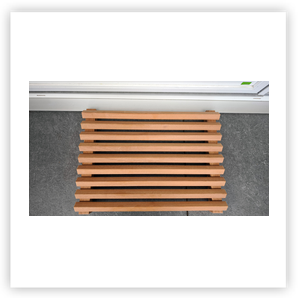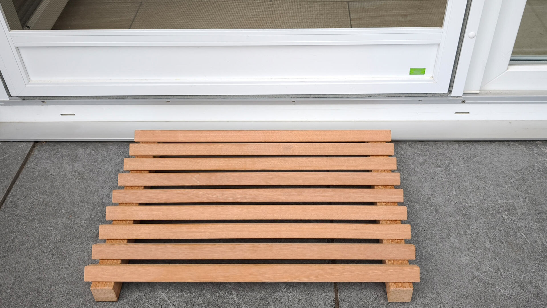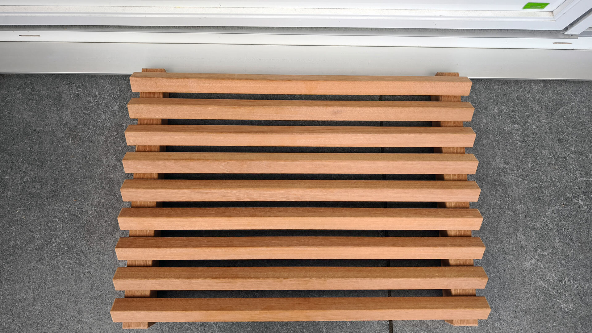 Wer vom Feld oder aus dem knietiefen Garten mit Gummistiefeln voller Matsch und Steinchen nach Hause kommt, der wird diesen Schuhrost aus Holz zu schätzen wissen. Nicht nur, weil die neun scharfkantigen Leisten zuverlässig die Anhaftungen entfernen, sondern weil der Fußabtreter auch sehr schön ausschaut.