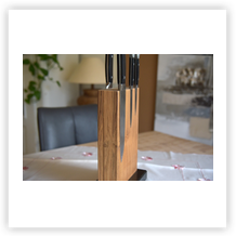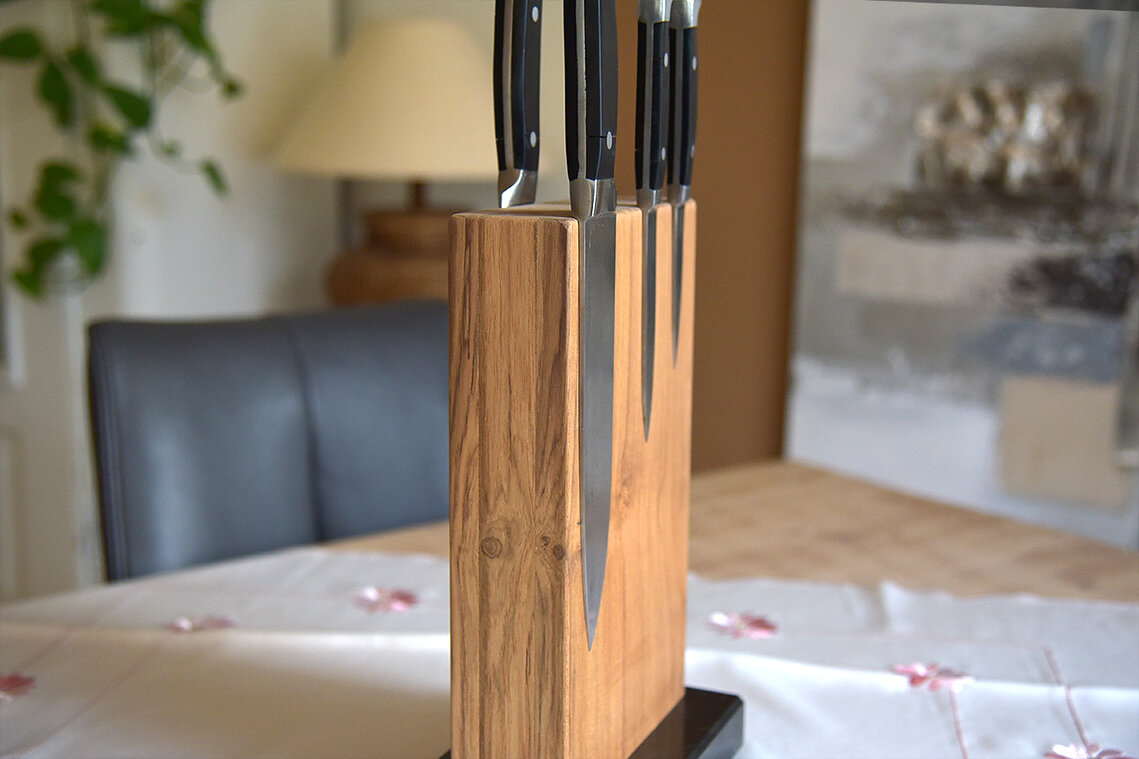 MesserblockNeben den ansprechenden Look in Teakholz, befindet sich im Innern der Konstruktion ein "sehr starkes Magnetfeld", das dafür sorgt, dass die Messer von beiden Seiten (Vorder- und Rückfläche) optimalen halt finden. Ein besonderer Vorteil gibt es auch im Punkt „Hygiene“. Werden bei den meisten Konkurrenzmodellen die Messer jeweils in einem dafür vorgesehenen Schlitz eingeschoben, müssen hier lediglich die Messer nur noch in Verbindung des Magneten nur noch angelegt werden, ohne dabei Bakterien in den Schächten fürchten zu müssen.Der Fuß besteht aus einer massiven schwarzen Granitplatte, was für eine weitere hohen Standfestigkeit sorgt und diesen Messerblock nochmals ein stückweit aufwertet. Einfach nur genial und ein echter Hingucker für Ihre Küche.Grundabmessungen:Größe der Messerauflage (beidseitig) jeweils 27 cm x 17 cmTiefe vom Messerblock 6 cmDie Granitplatte hat ein Maß von ca. 19,50 cm x 11,50 cm und eine Höhe von 3 cmBei uns ist der Messerblock in verschiedenen Varianten erhältlich! Die leicht schräge Form hat eine etwas kleinere Messerauflage.Preise auf Anfrage!