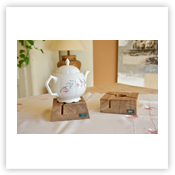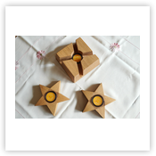 Die „exklusiven Aufbewahrungsboxen“, ebenfalls handgefertigt, schmücken zudem den Tisch mit ihren besonderen Formen. Die eckige Form gibt es jeweils für 6 und 12 Untersetzer, die zwei schrägen Varianten gibt es jeweils mit 6 Untersetzern. Alle vier Varianten der Aufbewahrungsboxen sind beliebig mit den Untersetzern kombinierbar.