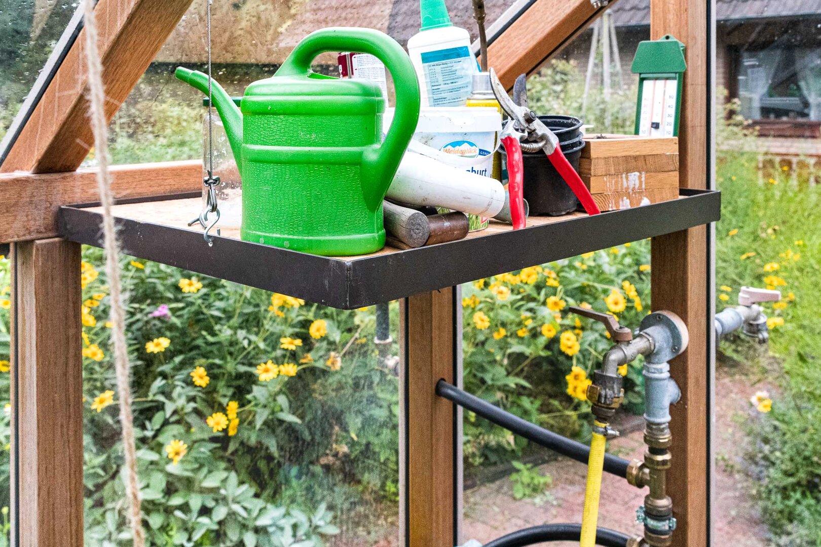 Hartglas gehört bei diesem Gewächshaus zur Norm, sowie eine gute Belüftung u. a. durch Aufstellfenster, ein integriertes Alu Fundament, (also keine Holz, das den Boden berührt) sowie Dachrinnen und Fallrohre. Sehr praktisch sind auch die von uns individuell gefertigten klappbaren Pflanzregale sowie Pflanztische. Diese können selbstverständlich auf Wunsch dementsprechend von uns Maßgerecht angefertigt werden.